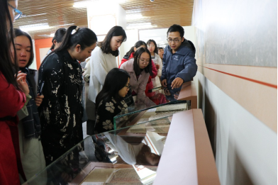 古籍资源服务中心工作人员在展厅为古典文献专业本科生介绍馆藏善本古文献