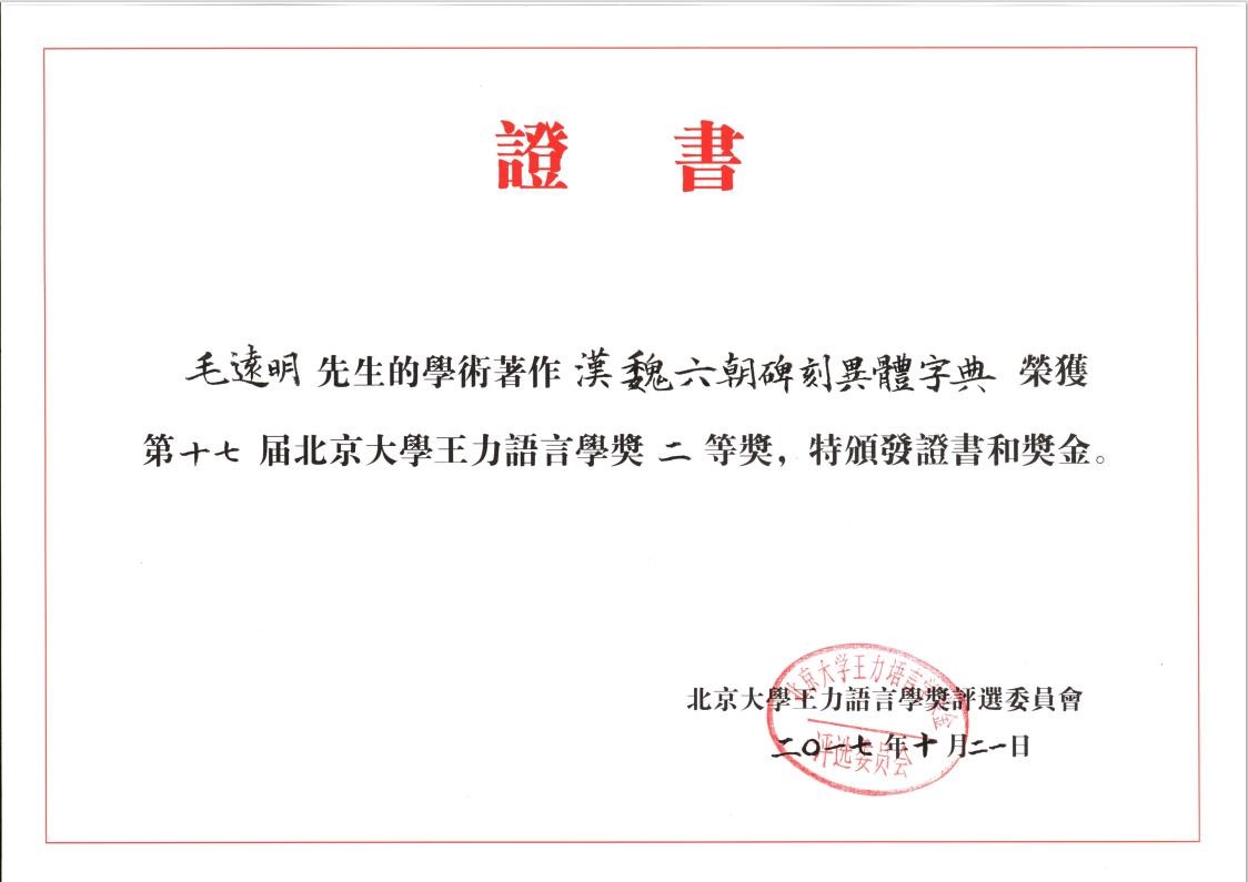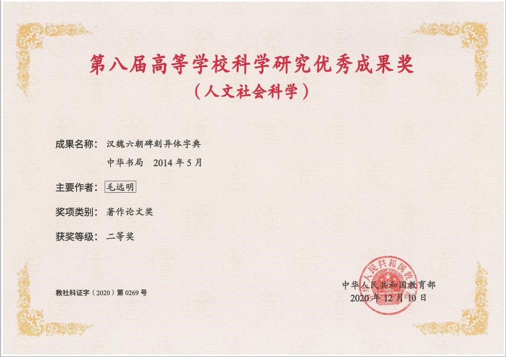 | 毛远明 | 汉魏六朝碑刻异体字典 | 第八届中国高校人文社会科学研究优秀成果奖二等奖 | 2020 |